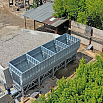 Бункер для сыпучих материалов из 4 секций объемом по 25 м3. Общий объем бункера – 100 м3. Изготовлен из нержавеющей стали толщиной от 4 мм и может быть оцинкован, либо окрашен в фирменные цвета заказчика опционно. Оснащен челюстными затворами под управлением пневматических цилиндров производства CAMOZZI (Италия). Дополнен специальной отсеивающей решеткой, исключающей попадание в смесь крупных фракций или мусора и предотвращающей поломку бетоносмесителя. По желанию заказчика может быть исполнен в зимнем оснащении и укомплектован системой обогрева материалов и утепленными крышками.
